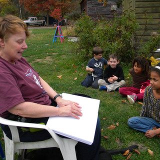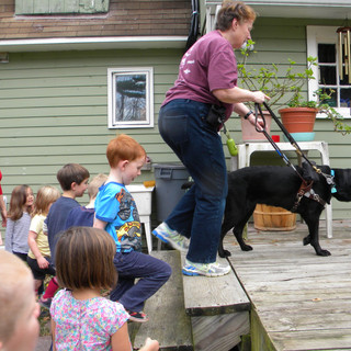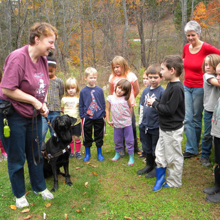 My friend Linda came this week to share a few of her experiences as a blind person and to let us meet her guide dog Ada. The children were impressed with Linda's talking computer, talking thermometer, Braille measuring cup, color reader, and Cooking Light magazine (also in Braille). They asked questions, listened to the answers, and asked new questions. Linda had Ada find the stairs onto the deck and find the door to the house. Linda told us some of the many other things Ada can do from finding poles with crosswalk buttons to finding bus shelters. The children clearly wanted to learn more, but as we were well into our lunch time, Linda offered to come back another time to talk with us more. Lucky us!