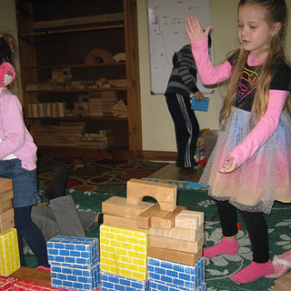 Walking around during "free play" this last week I snapped the pictures above. I was intrigued by the variety of tasks and the intense focus in each place. In one room, a child was playing teacher, reviewing letter sounds with a small class of students and drawing letters on the board. In another room, children were sorting dice and pattern blocks, then creating intricate designs with each. Two of our older students crafted a "morning message" for some of our younger students, and I worked with them to edit and improve their writing. Five children were building with blocks, an exercise in negotiating and compromise as they included different visions of the final product. I saw work happening in literacy, math, social, and emotional skills. Small and large motor skills were engaged. But if you asked them what they did, they'd say, "We played."