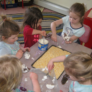 Though we are finishing our five senses (what does Winter sound like - quiet or loud?) we will be continuing to use those senses to explore our natural world each day outside since we've become experts. We crafted bird feeders made from pine cones as we talked about how to be kind to animals who may have a hard time in winter finding food. We even placed one outside of our main classroom window to spy if the birds will be grateful. The concept of "family" has been introduced and we will delve into that theme in the coming weeks. A Family is a Family is a Family has us talking about all different kinds of families which led to a lively discussion about our very own families. Wild Family helped us understand that animals have families (and personalities) too and One Family had us counting family members. I love how one student pointed out that our rhyming read aloud from a prior week - The Seven Silly Eaters - had a different kind of family (very big!). I took the groups' interest to read that one again to everyone's glee (I love being able to do this). Each day these smallest children amaze me with their growth: from being detectives for words that start with the letter 'T' to practicing writing their own names. However, what I find most important for this age is allowing them the time and space to play - both outside in the snow (moved slides to land into a snow bank this week) and inside with the snow (in our sensory bin making houses for our family dolls or animals).