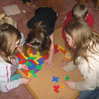 Every day our children have choice time. On Friday, I walked from room to room and saw our kids so very actively engaged in a wide range of choices. One group was planning, rehearsing, and performing a puppet show. Another group was building a lengthy domino chain creation. Still others were cutting up pie - talking about fractions, counting pieces, and adding the different types of pie for a total pie count. Every single child was actively engaged in their learning. I loved watching them at work: negotiating solutions to problems, using mathematical thinking (and vocabulary), and making plans that they modified as their projects progressed.